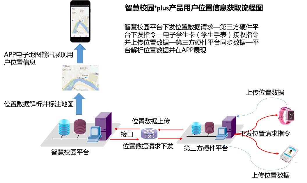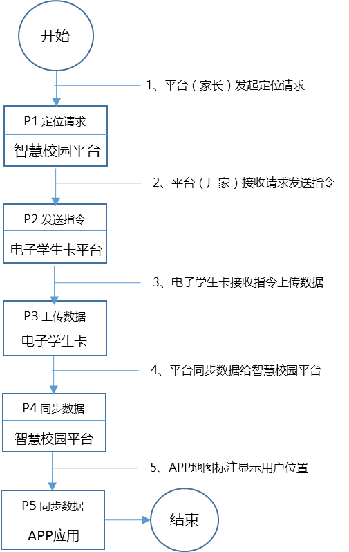P1 定位請(qǐng)求:由家長在APP應(yīng)用中的定位模塊界面點(diǎn)擊“定位”鏈接或在地圖界面點(diǎn)擊“位置刷新”按鈕,由智慧校園平臺(tái)向電子學(xué)生卡廠家平臺(tái)發(fā)起定位請(qǐng)求